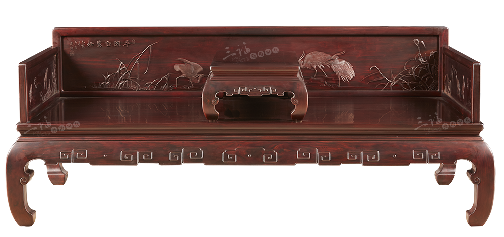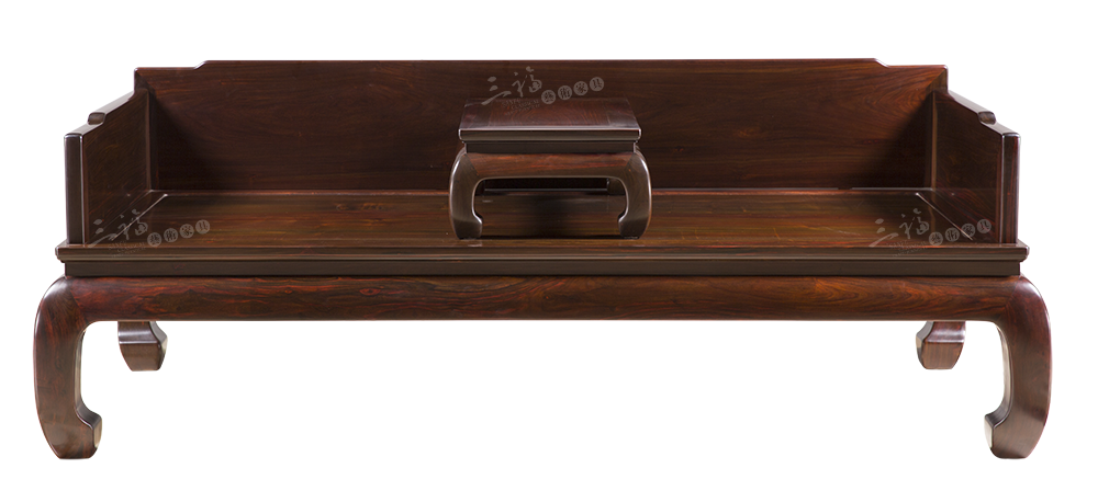 此皇宫椅靠背板为三截攒框,上截开光部分透雕卷草花纹,中截绦环板不作雕饰,下截雕云纹朝下亮脚,外轮廓似倒挂的蝙蝠,寓意“福到”。扶手出头外弯的圆弧之内和四足马蹄内面以上,透雕卷草纹, 特别是扶手出头处是难度极高的三面透雕加浮雕,面板下设束腰, 彭牙鼓腿,更显沉稳大方,四足下有托泥。